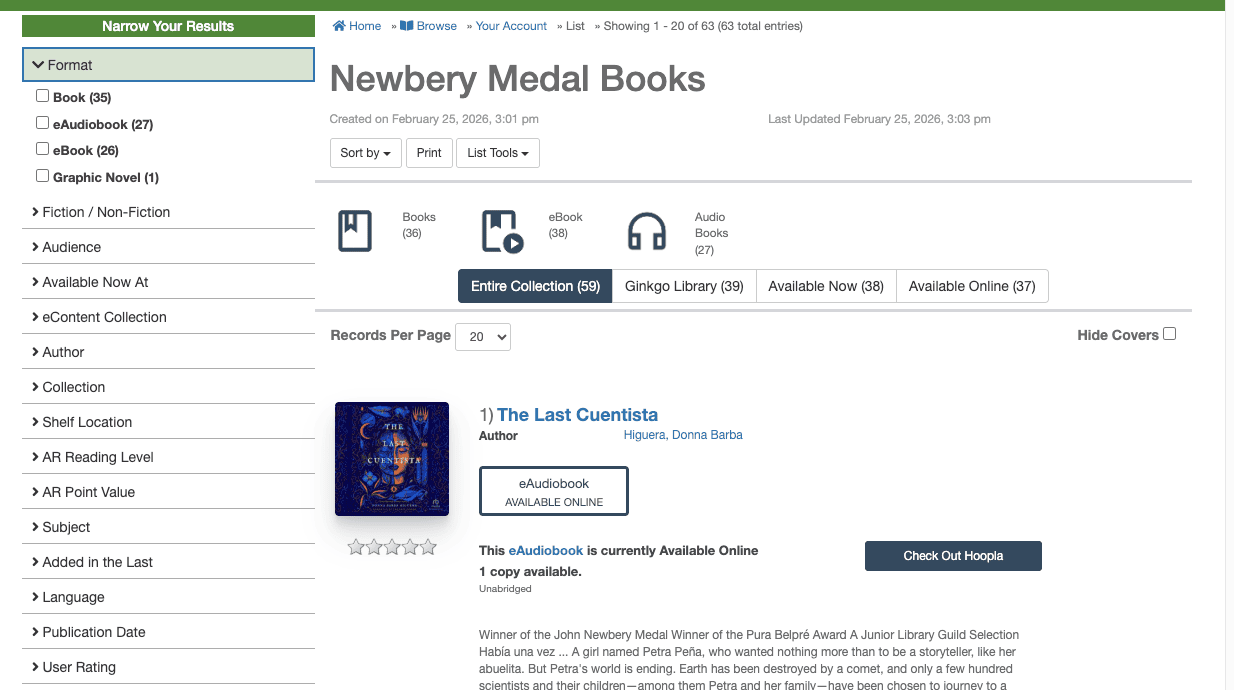 Aspen 26.02 introduces faceted filtering for lists, giving patrons and librarians new ways to explore and manage curated content. Libraries can now create more usable, dynamic lists that allow users to filter by format, availability, subject, and other criteria.